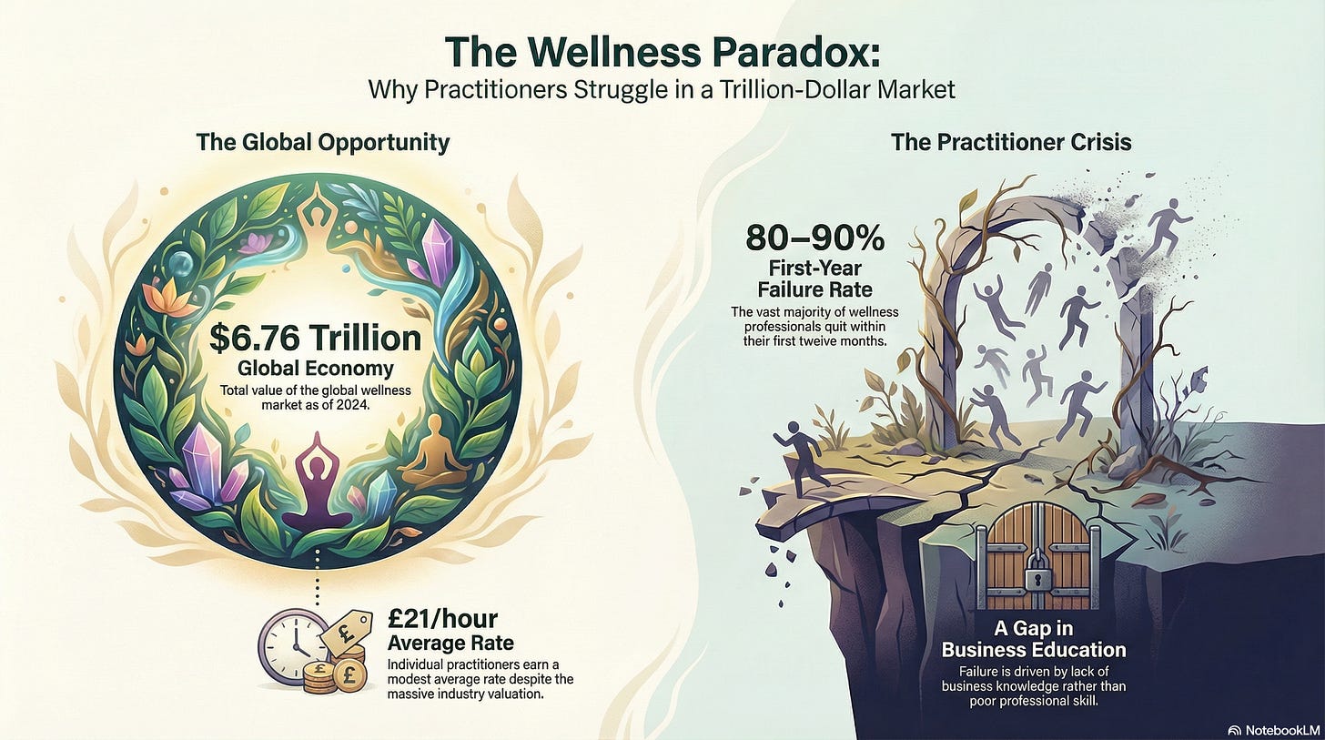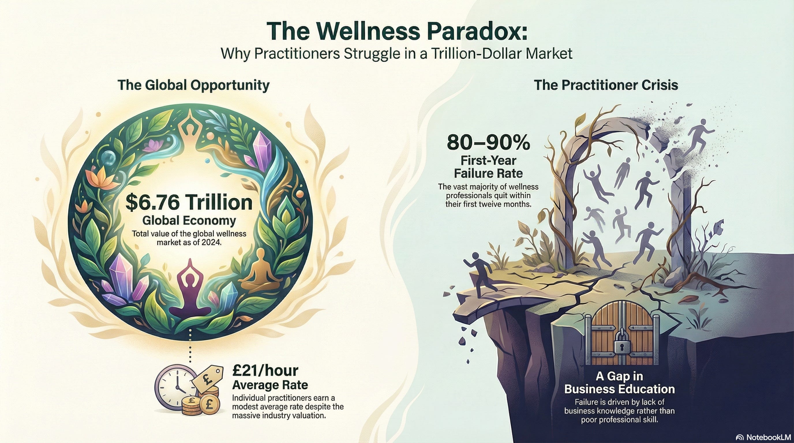 So you have a $6.76 trillion wellness economy producing excellent practitioners who cannot sustain a career, feeding into a corporate wellness market that is actively contracting because it cannot demonstrate value.