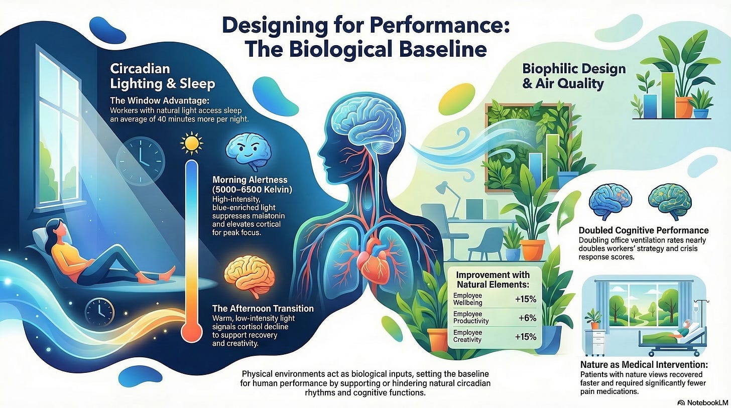 Circadian lighting, biophilic elements, air quality, acoustic design, and access to natural views are not decorative choices. They are inputs into human performance that operate before any program, app, or EAP is activated.