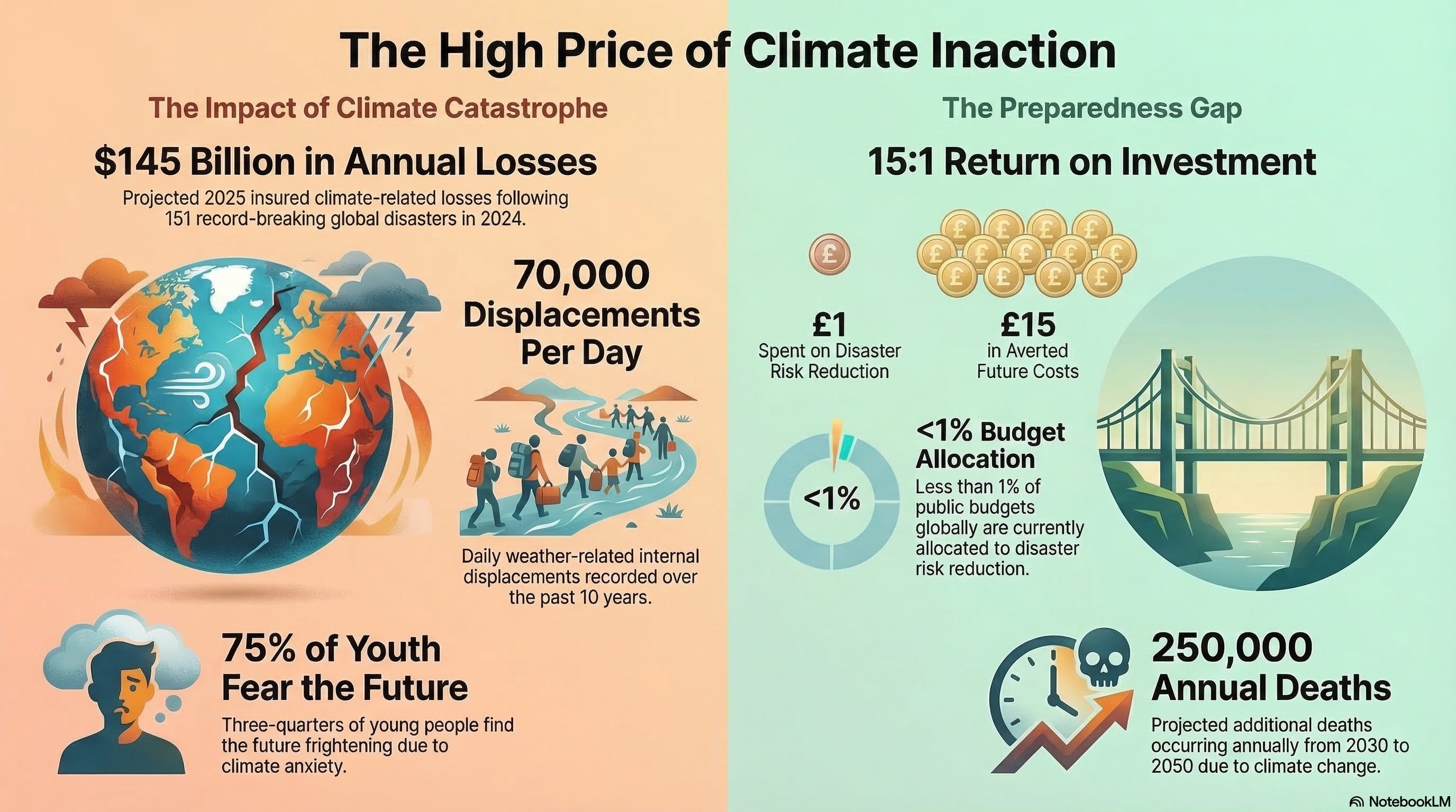 The preparedness gap: Studies indicate that every $1 spent on disaster risk reduction delivers an average return of $15 in averted future costs. Despite this, less than 1% of public budgets globally are allocated to disaster risk reduction.