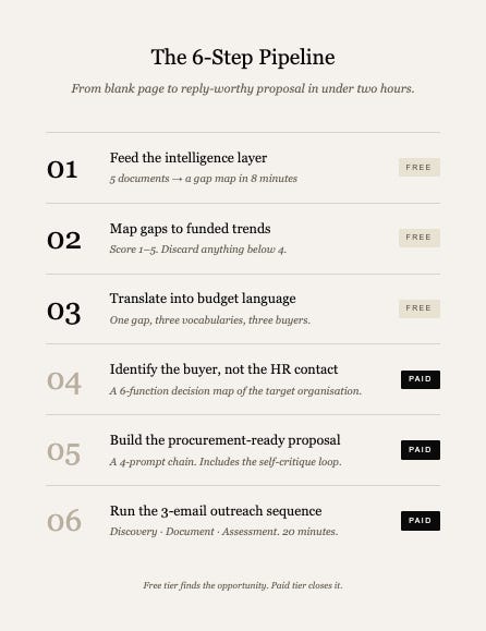 Step 5 — The procurement-ready proposal chain. The 4-prompt sequence that produces a 1-page executive summary, a 3-page proposal with KPIs tied to business outcomes, and a finance-ready ROI projection.
