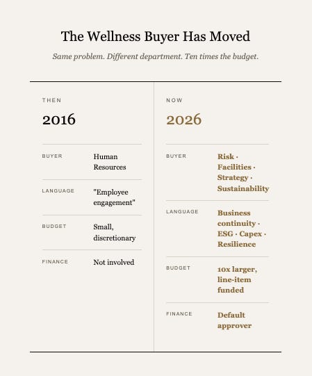 Ten years ago the wellness buyer was HR and “employee engagement” was the vocabulary. The budget was small, and nobody on the finance side cared.