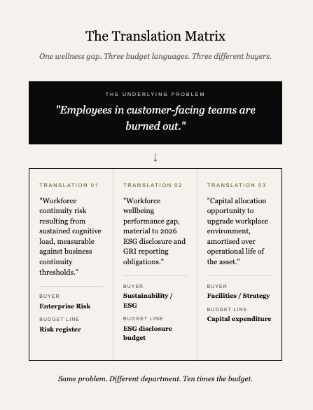 In 2026 the buyer is increasingly Risk, Facilities, Strategy, or Sustainability. The vocabulary is business continuity, ESG, capex, and workforce resilience. The budget is an order of magnitude larger.