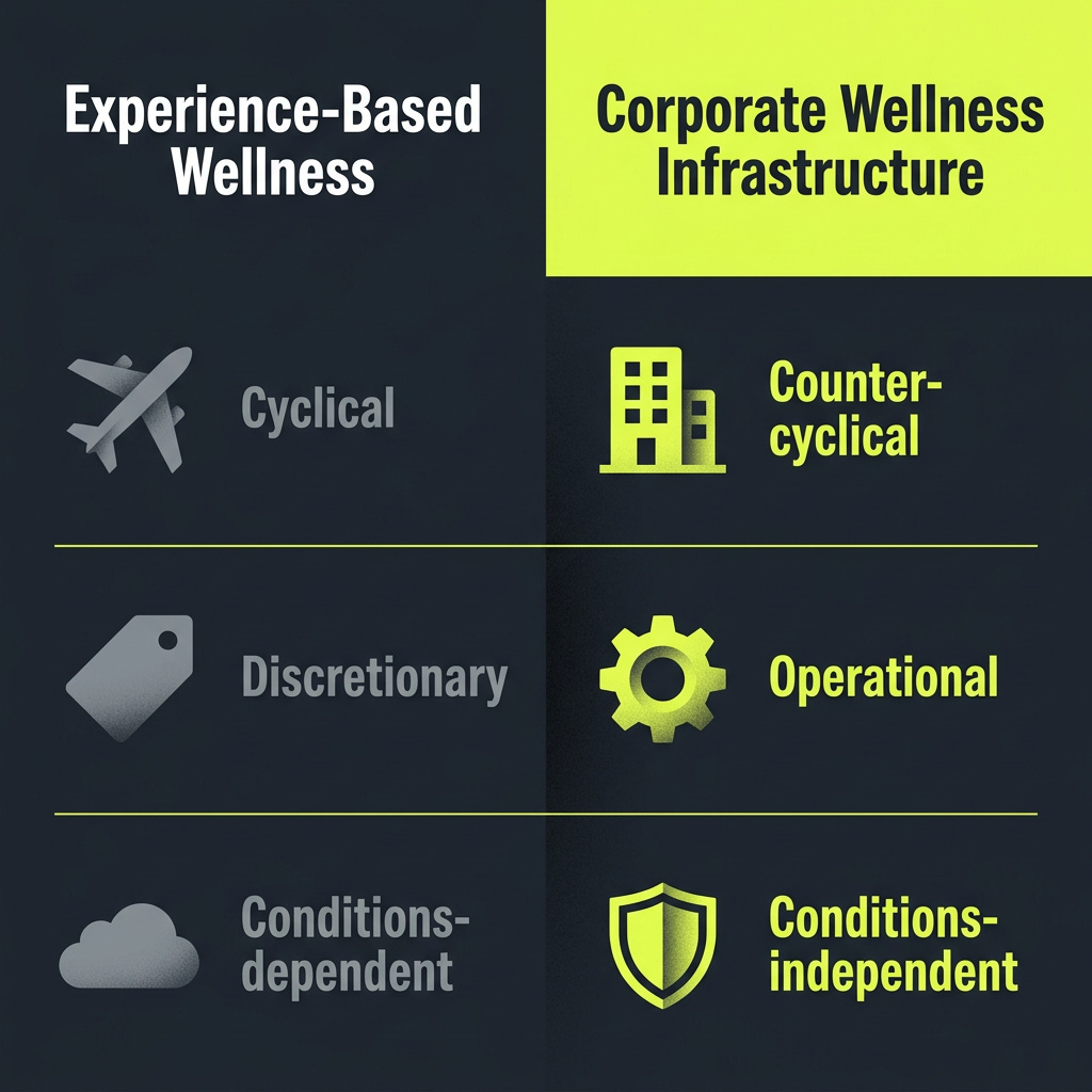 The first sells experiences to people who travel to consume them: retreats, spas, and luxury longevity programs. When external shocks hit, economic disruption, regional instability, and discretionary travel contracts.