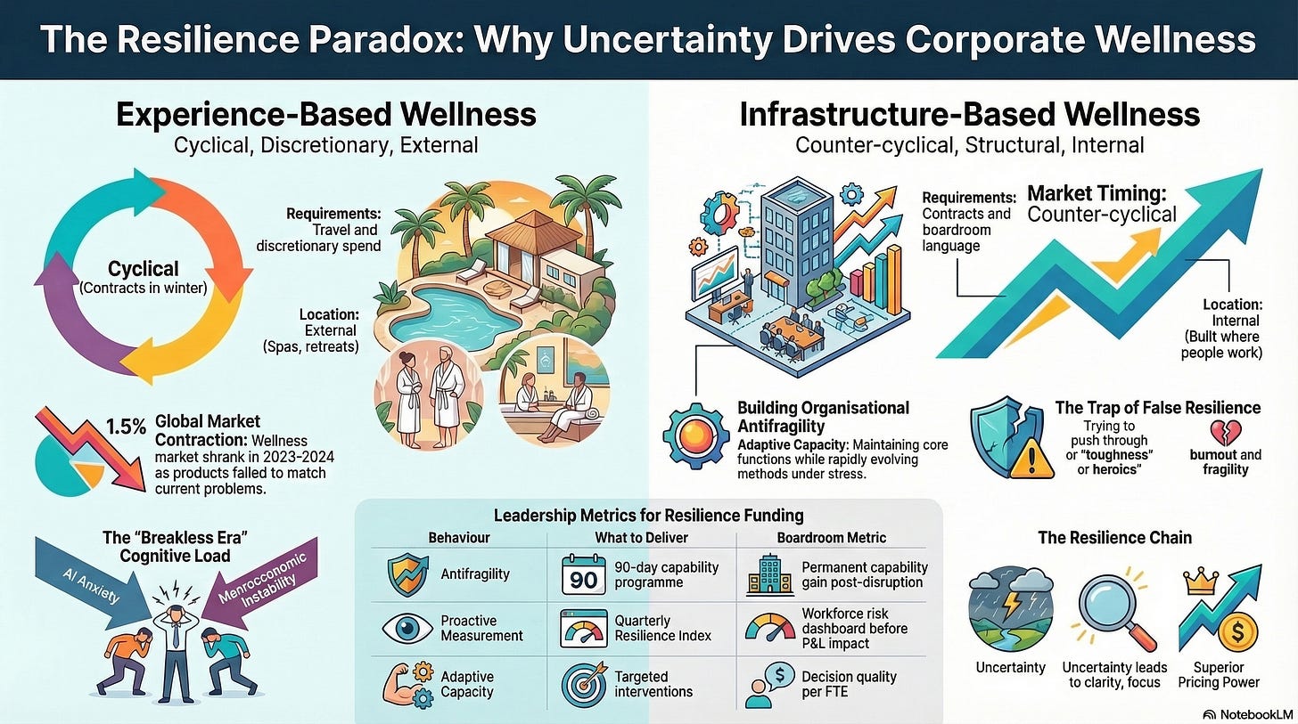 The global workplace wellness market shrank 1.5% last year. Not because companies stopped caring. Because the product was wrong. The professionals who figured that out are operating in a completely different budget.