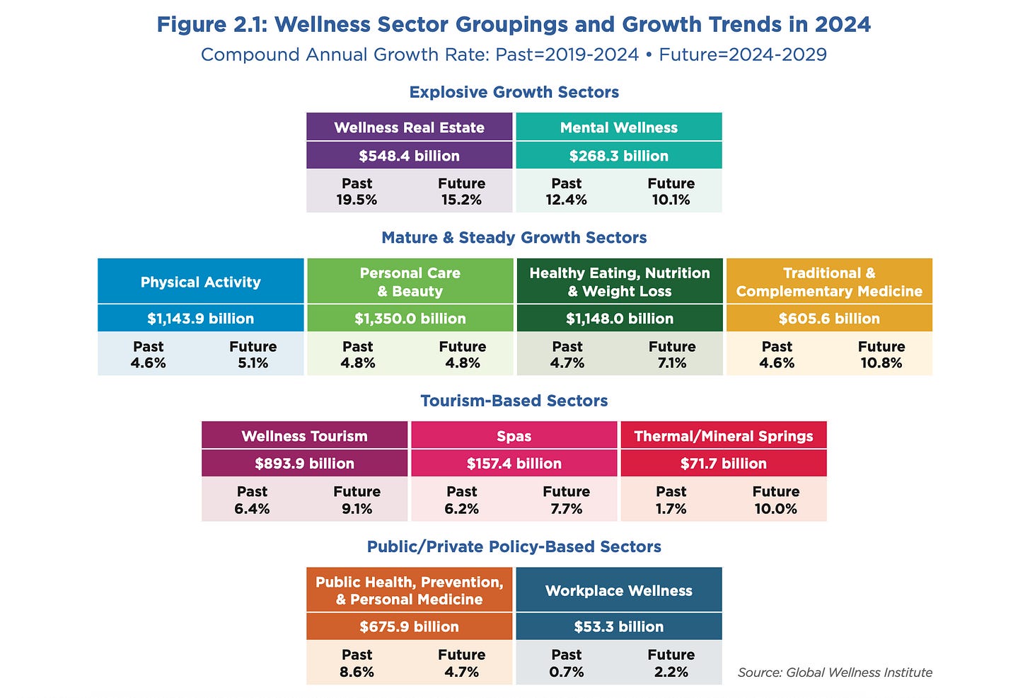 If you are looking for the fastest growth, stop looking at supplements and start looking at buildings. Wellness Real Estate is the “Hero Sector,” growing globally at 19.5%.